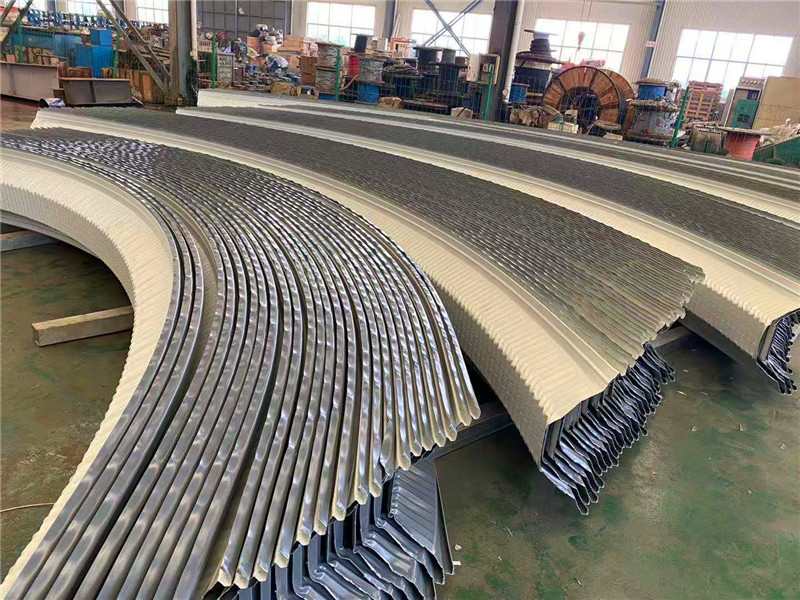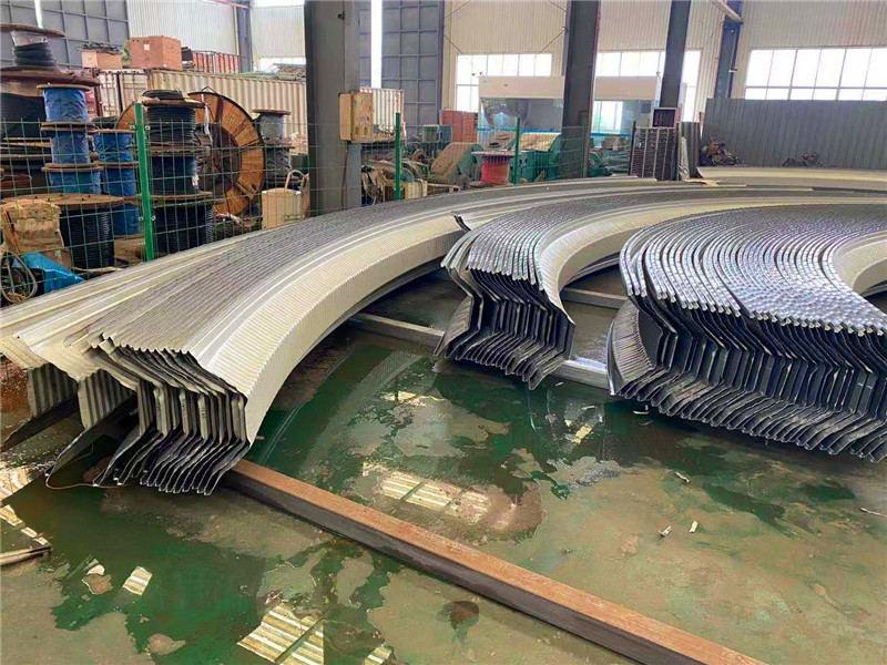 本次拱形屋頂單元板工程主要服務(wù)于某出口型廠房的建筑改造升級(jí),客戶對(duì)結(jié)構(gòu)穩(wěn)固性、現(xiàn)場(chǎng)加工效率及防護(hù)性能提出了較高要求。根據(jù)需求,江蘇杰達(dá)鋼結(jié)構(gòu)工程有限公司選用了厚度為1.2mm的鋼板原材料,壓制成寬度為0.61m的成型瓦片,并采用現(xiàn)場(chǎng)彎板壓型技術(shù)進(jìn)行施工。