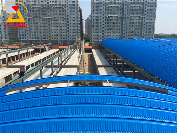施工前需定制專用的拱形屋頂采光帶,確保尺寸和曲率精準(zhǔn)匹配。組裝過程中,在每榀拱形屋頂中部安裝兩道角鋼支撐,提高結(jié)構(gòu)穩(wěn)定性。