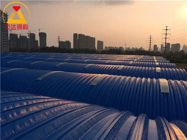 施工完成后,拱形屋頂在自然光下表現(xiàn)出良好的采光效果,采光帶間隔合理,提升了屋頂整體的采光與美觀度。從屋頂內(nèi)側(cè)仰視,采光帶呈現(xiàn)均勻的光線分布,保證了室內(nèi)光照的舒適度。