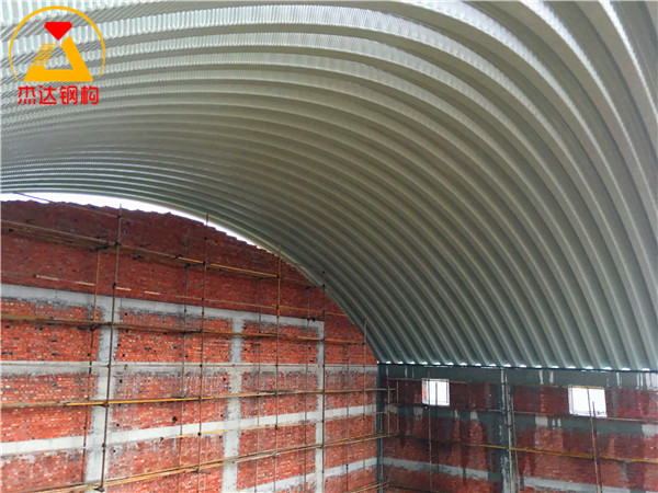 拱形屋頂設(shè)計在跨度和長度上經(jīng)過精準(zhǔn)計算,能夠有效承受外部風(fēng)壓和自重。螺紋鋼的采用增強了屋頂?shù)恼w穩(wěn)定性,托板和彩涂卷板的合理搭配進一步提升了抗腐蝕性能和使用壽命。