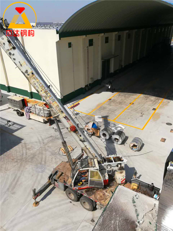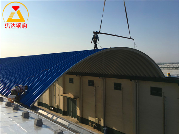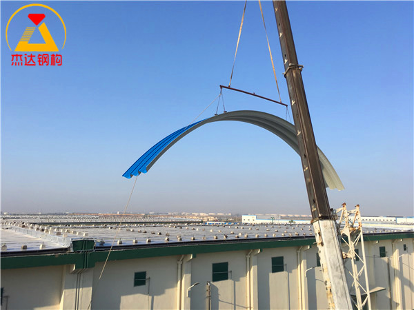 該拱形屋頂跨度17.9米,長度856米,總建筑面積為1521.5平方米。施工中使用1.0mm厚的高強(qiáng)彩涂卷材,結(jié)合焊接托板,實(shí)現(xiàn)了矢跨比為0.2的穩(wěn)定拱形結(jié)構(gòu)。