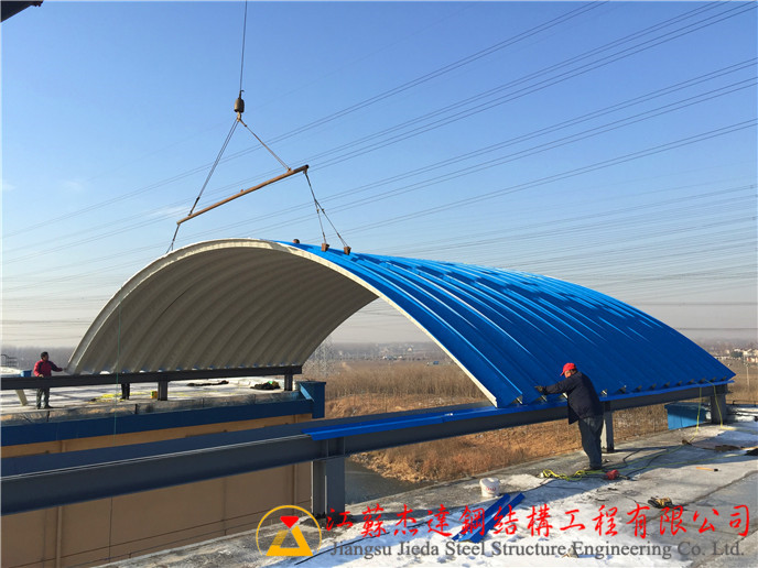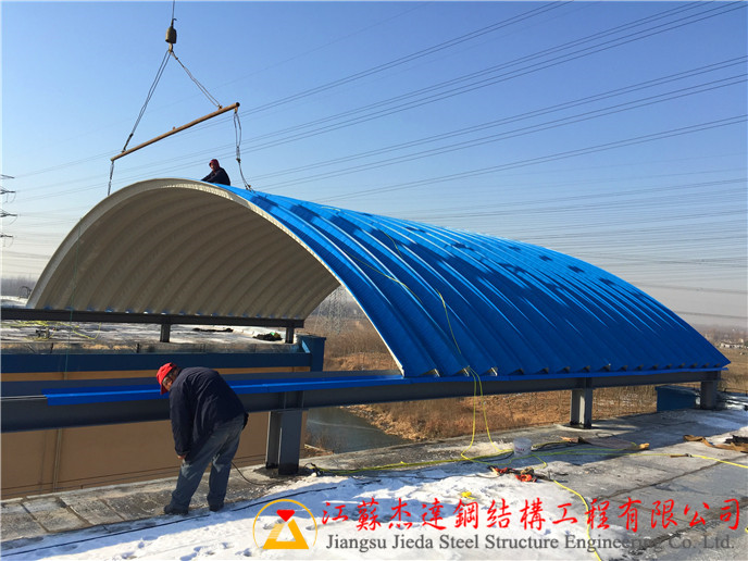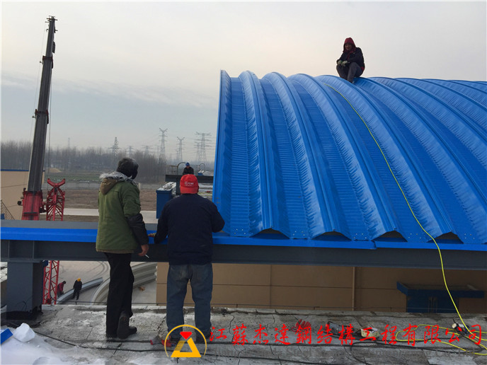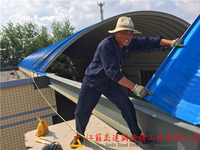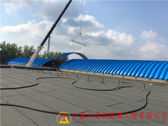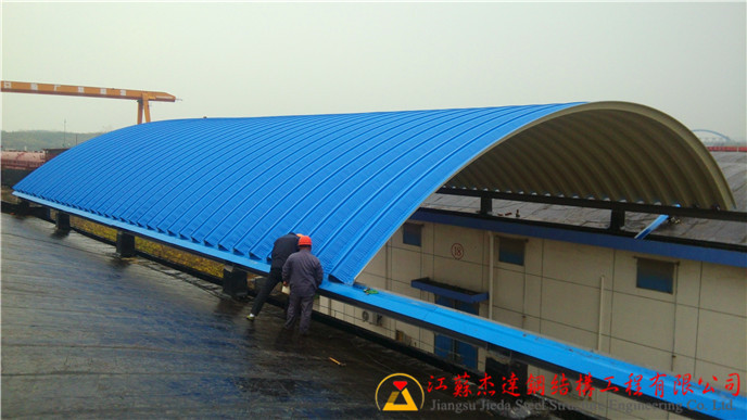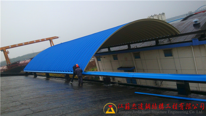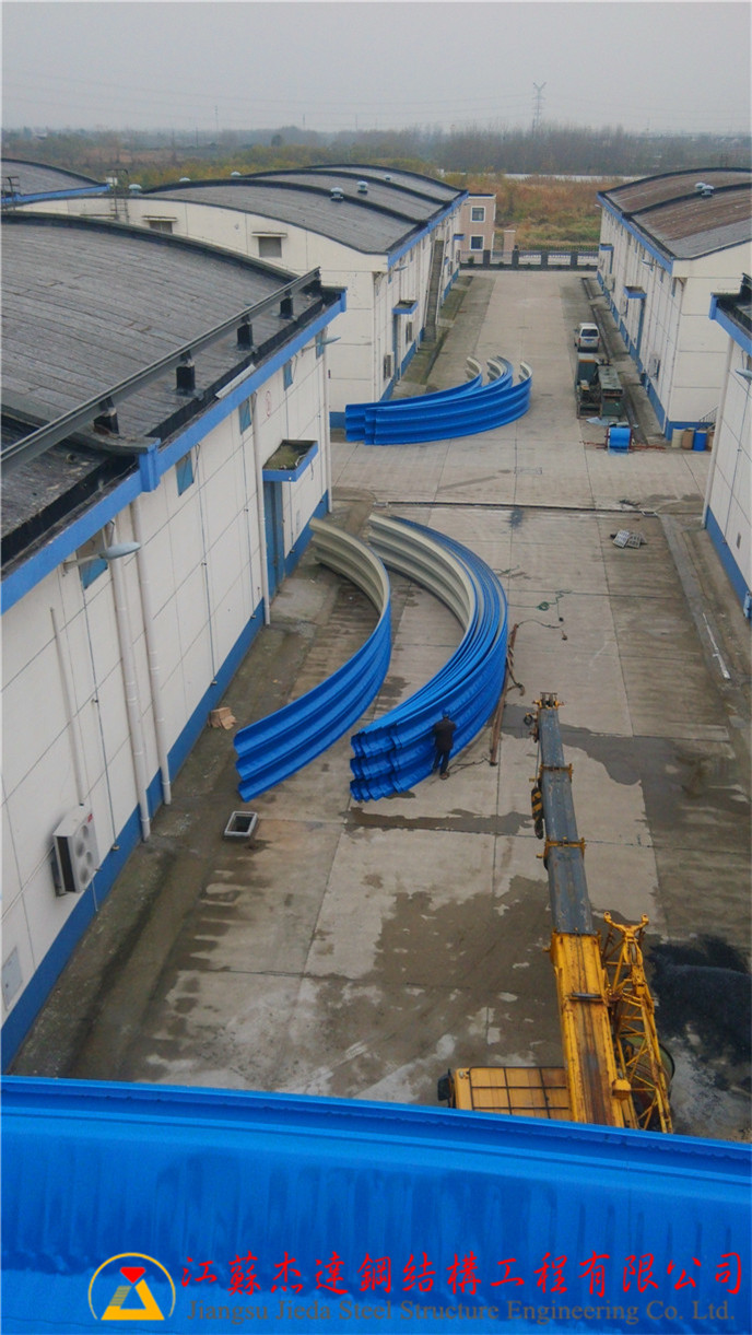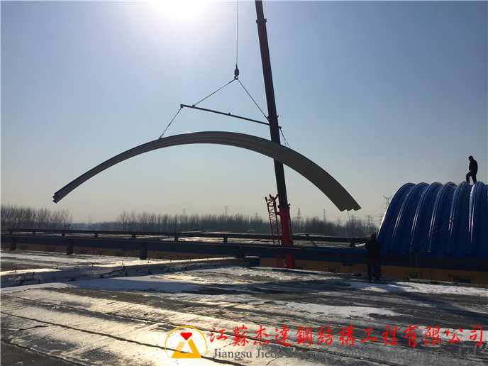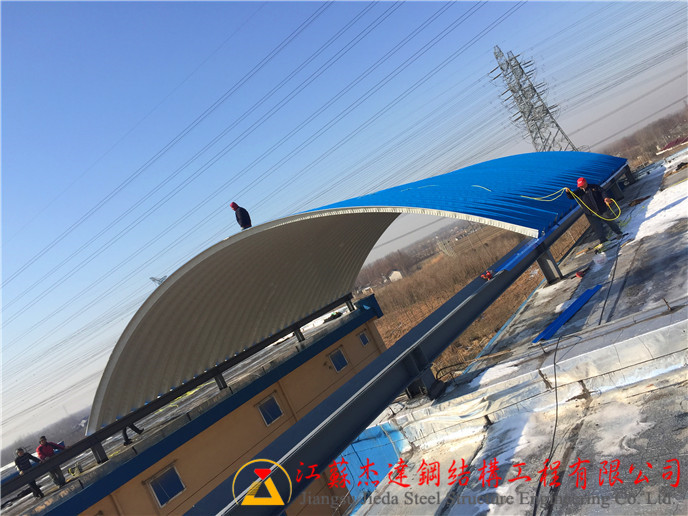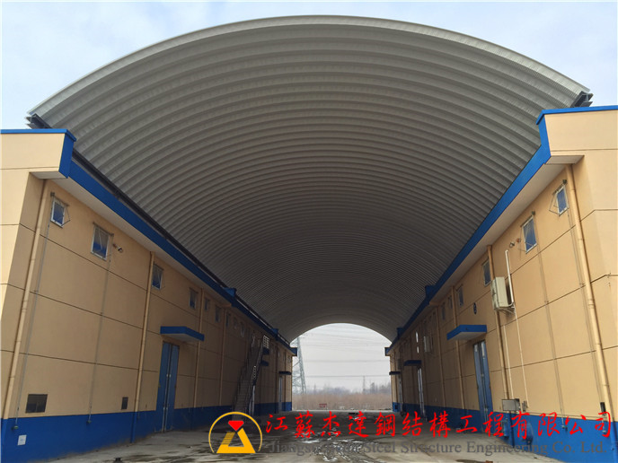 江蘇杰達(dá)鋼結(jié)構(gòu)工程有限公司承建的過道式拱形屋頂,主要用于堆放物料和設(shè)備。該結(jié)構(gòu)設(shè)計能夠在陰雨天氣下為糧食儲備庫提供良好的保護(hù)環(huán)境,確保設(shè)備和物資的安全存放與使用。