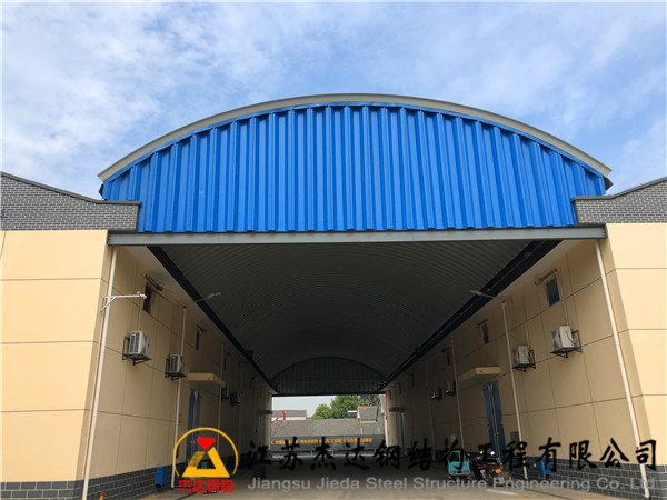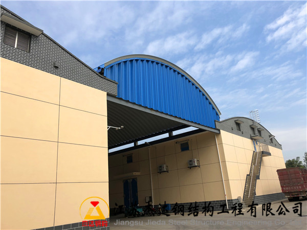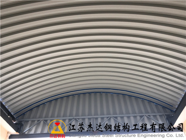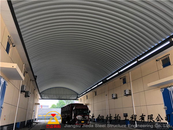 該項(xiàng)目位于江蘇省南京市浦口區(qū)糧食儲(chǔ)備庫(kù)內(nèi),罩棚跨度達(dá)16米,長(zhǎng)度60米,采用拱形波紋鋼屋蓋結(jié)構(gòu)。結(jié)構(gòu)兩側(cè)設(shè)有250*250H型鋼,上方焊接托板,配合兩側(cè)桁架支撐。桁架外側(cè)覆蓋了通過壓制成型的拱形瓦片,用作山墻,增強(qiáng)整體穩(wěn)定性與美觀度。