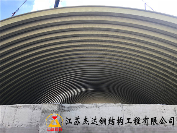 完工后的拱形波紋鋼屋蓋呈現(xiàn)出流暢的曲線與結(jié)構(gòu)穩(wěn)定性。矢跨比和拱高的比例設(shè)計(jì)保證了屋頂?shù)某休d能力與美觀性。