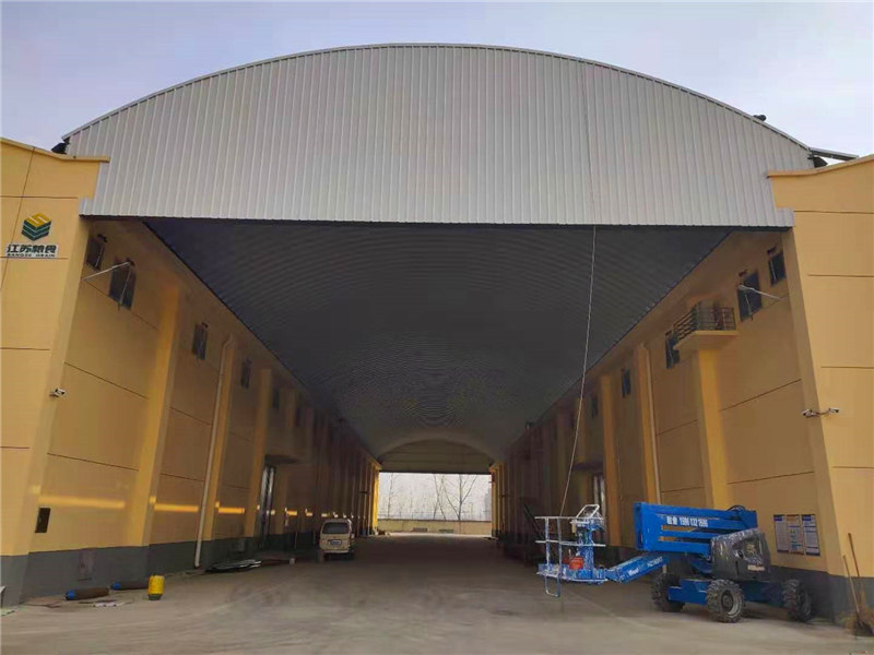 本工程位于江蘇省連云港和茂糧庫內(nèi),罩棚結(jié)構(gòu)為拱形屋頂形式,整體跨度約18米,長度80米,采用的屋面板材為海藍(lán)色,厚度為1.2mm,材料為TS280GD-Z鍍鋅鋼板,具備良好的防腐與承重性能。