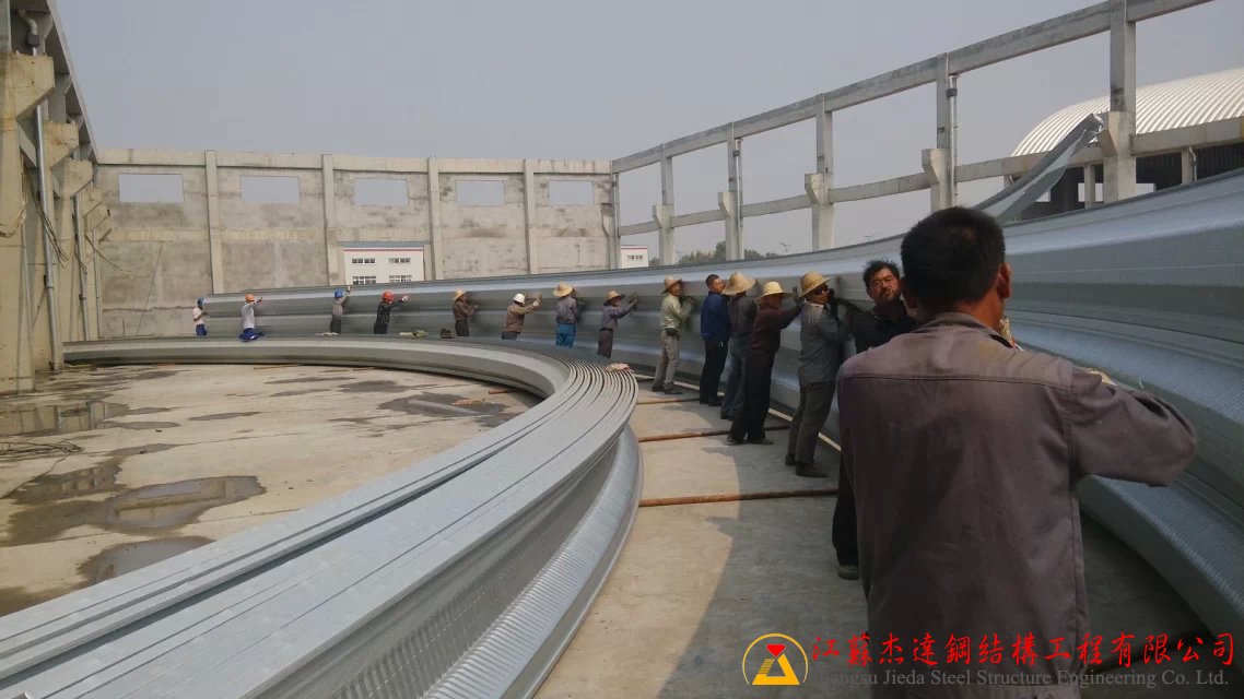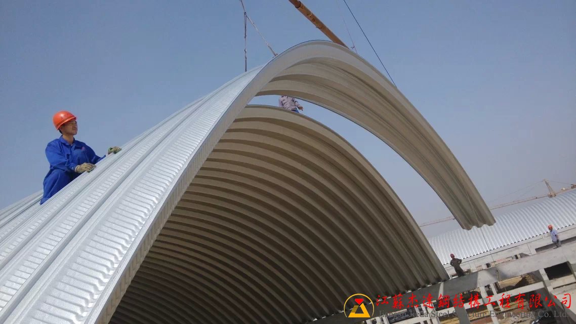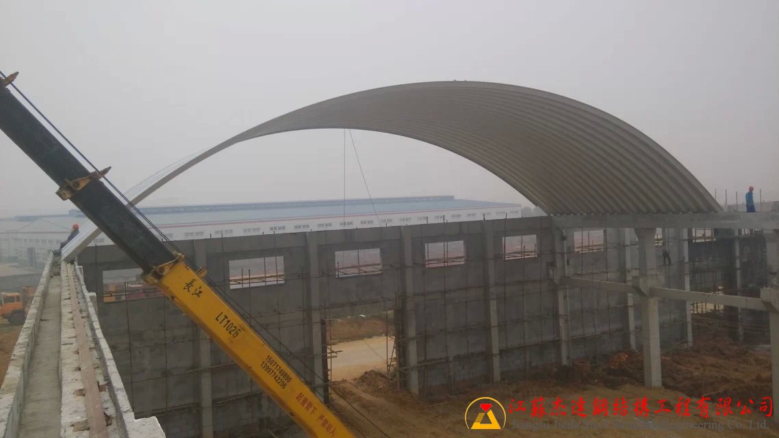本次拱形屋頂工程施工面積達8萬多平方米,施工單位江蘇杰達鋼結構工程有限公司憑借豐富的鋼結構施工經驗,采用科學施工方案,確保項目質量和進度。施工中嚴格執(zhí)行安全管理制度,加強現(xiàn)場監(jiān)控,保障施工安全無事故。